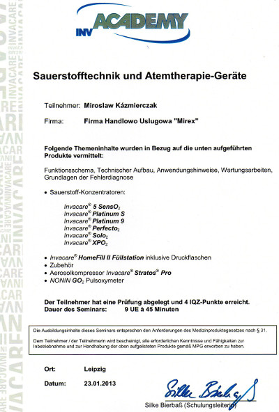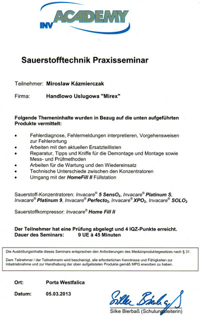 Wiedzę oraz umiejętności serwisowania i naprawy koncentratorów tlenu zdobyliśmy odbywając szereg szkoleń organizowanych przez renomowanego producenta sprzętu medycznego – firmę INVACARE ®.